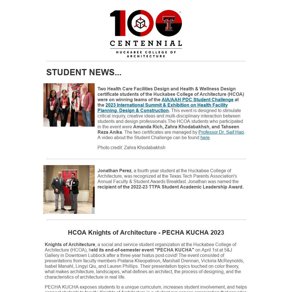 If you're not already, follow us on Instagram, Twitter, LinkedIn, and Facebook for the latest updates from the HCOA and be sure to like and share our content within your own networks! Do you have news or updates to share? Email architecture@ttu.edu for a possible feature in the next newsletter!