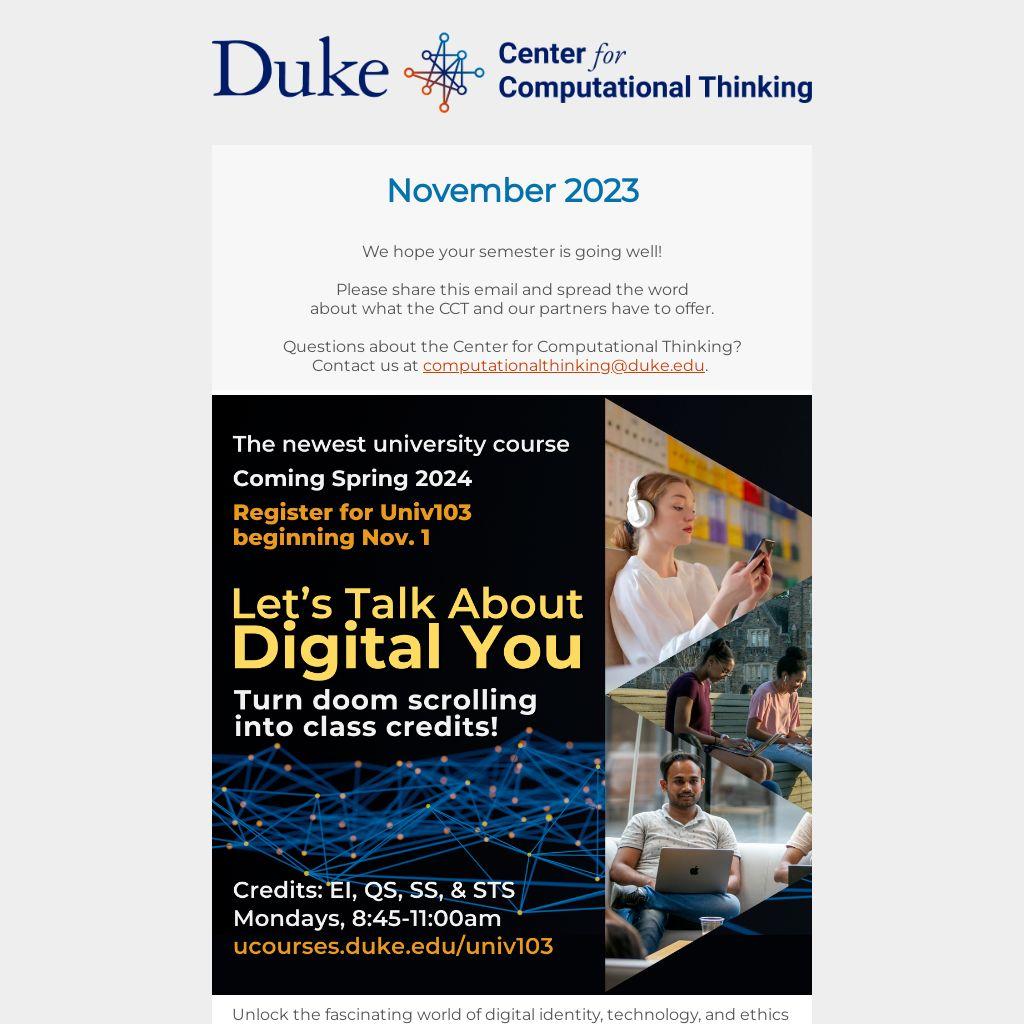 You're receiving this email because you participated in a Duke +DataScience learning experience or have expressed interest in the CCT.
