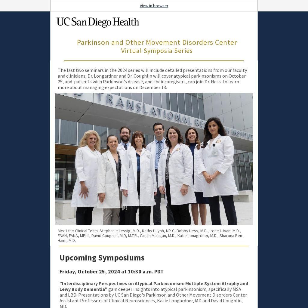 "Interdisciplinary Perspectives on Atypical Parkinsonism: Multiple System Atrophy and Lewy Body Dementia" gain deeper insights into atypical parkinsonism, specifically MSA and LBD. Presentations by UC San Diego's Parkinson and Other Movement Disorders Center Assistant Professors of Clinical Neurosciences, Katie Longardner, MD and David Coughlin, MD.