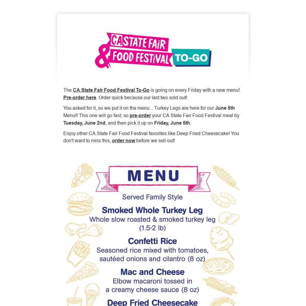 All you need to do is drive-thru the Main Gate to the California Letters and pick up the Fair food you have been missing and bring it home to your whole family.