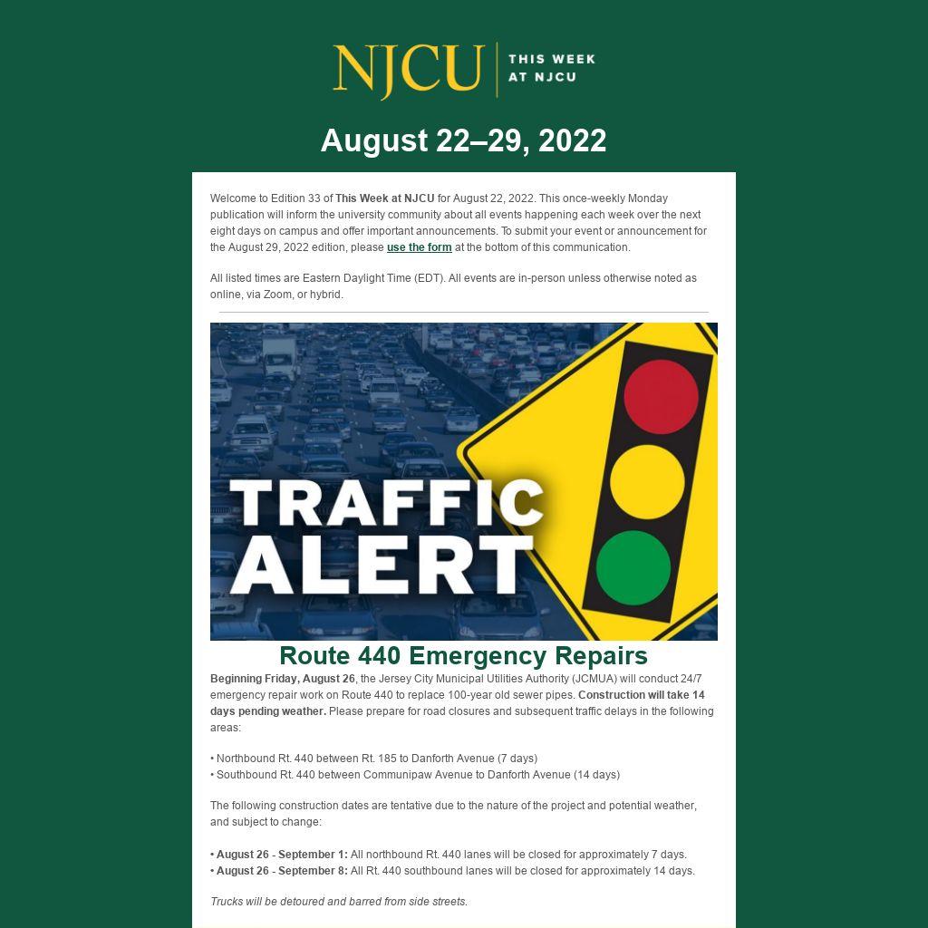 Welcome to Edition 33 of This Week at NJCU for August 22, 2022. This once-weekly Monday publication will inform the university community about all events happening each week over the next eight days on campus and offer important announcements. To submit your event or announcement for the August 29, 2022 edition, please use the form at the bottom of this communication.
