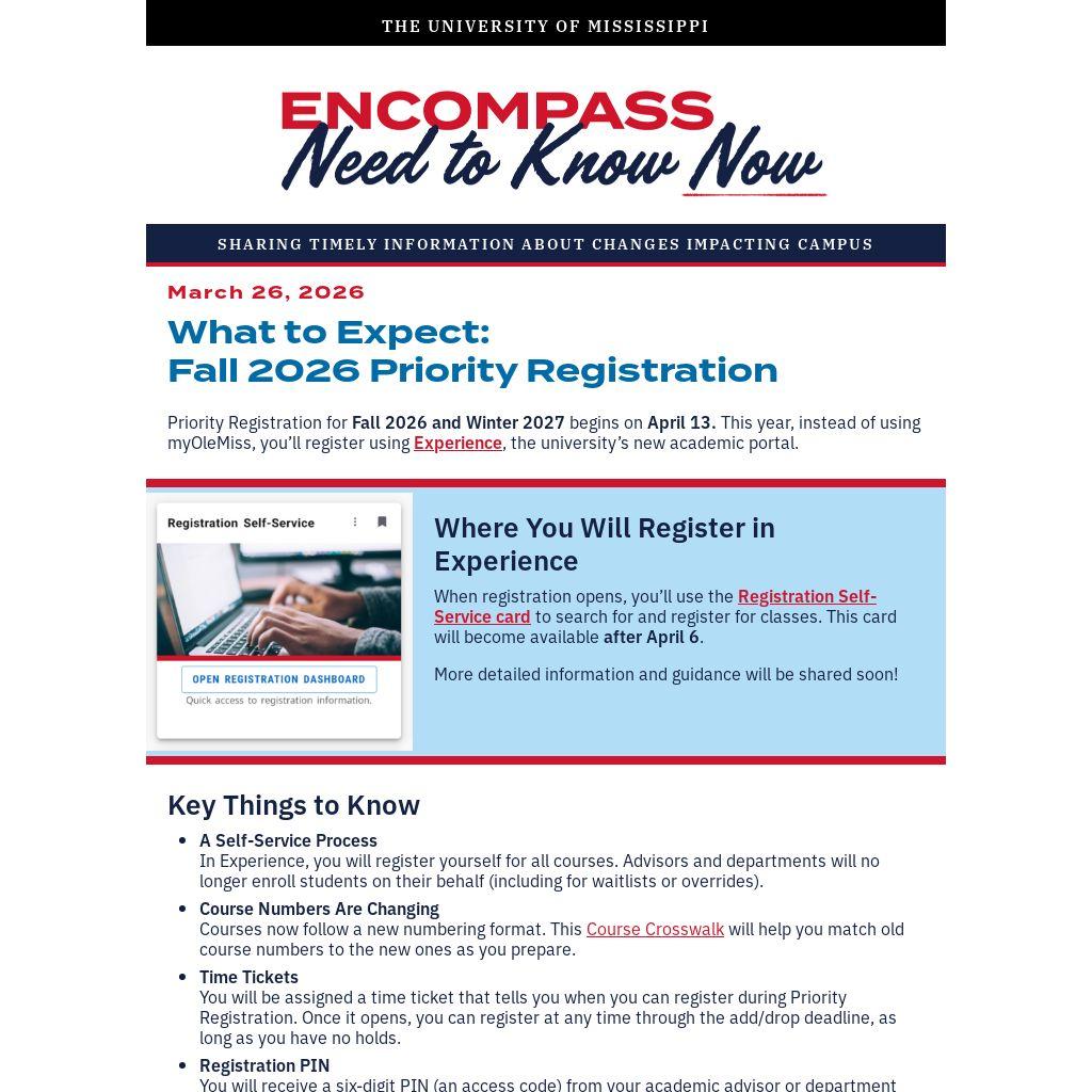 Priority Registration for Fall 2026 and Winter 2027 begins on April 13. This year, instead of using myOleMiss, you’ll register using Experience, the university’s new academic portal.