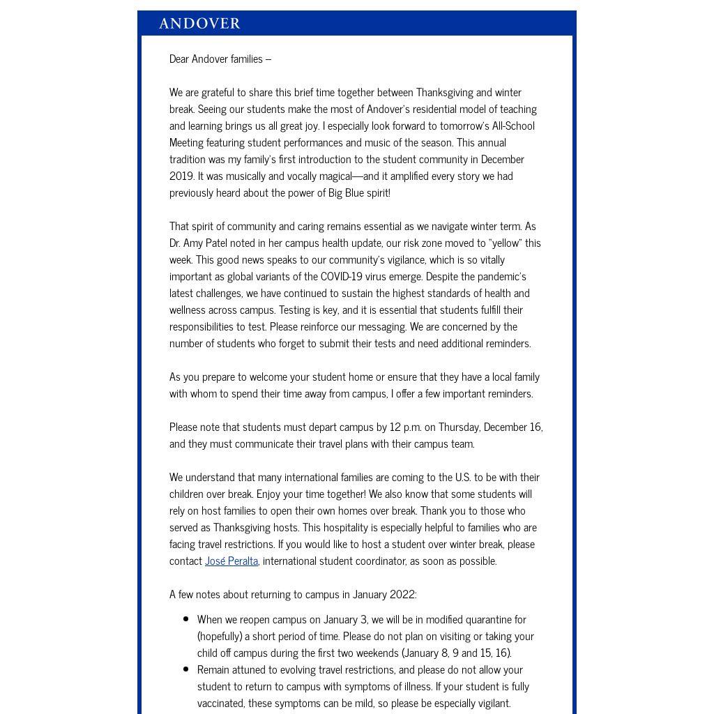 We are grateful to share this brief time together between Thanksgiving and winter break. Seeing our students make the most of Andover’s residential model of teaching and learning brings us all great joy. I especially look forward to tomorrow’s All-School Meeting featuring student performances and music of the season. This annual tradition was my family’s first introduction to the student community in December 2019. It was musically and vocally magical—and it amplified every story we had previously heard about the power of Big Blue spirit!