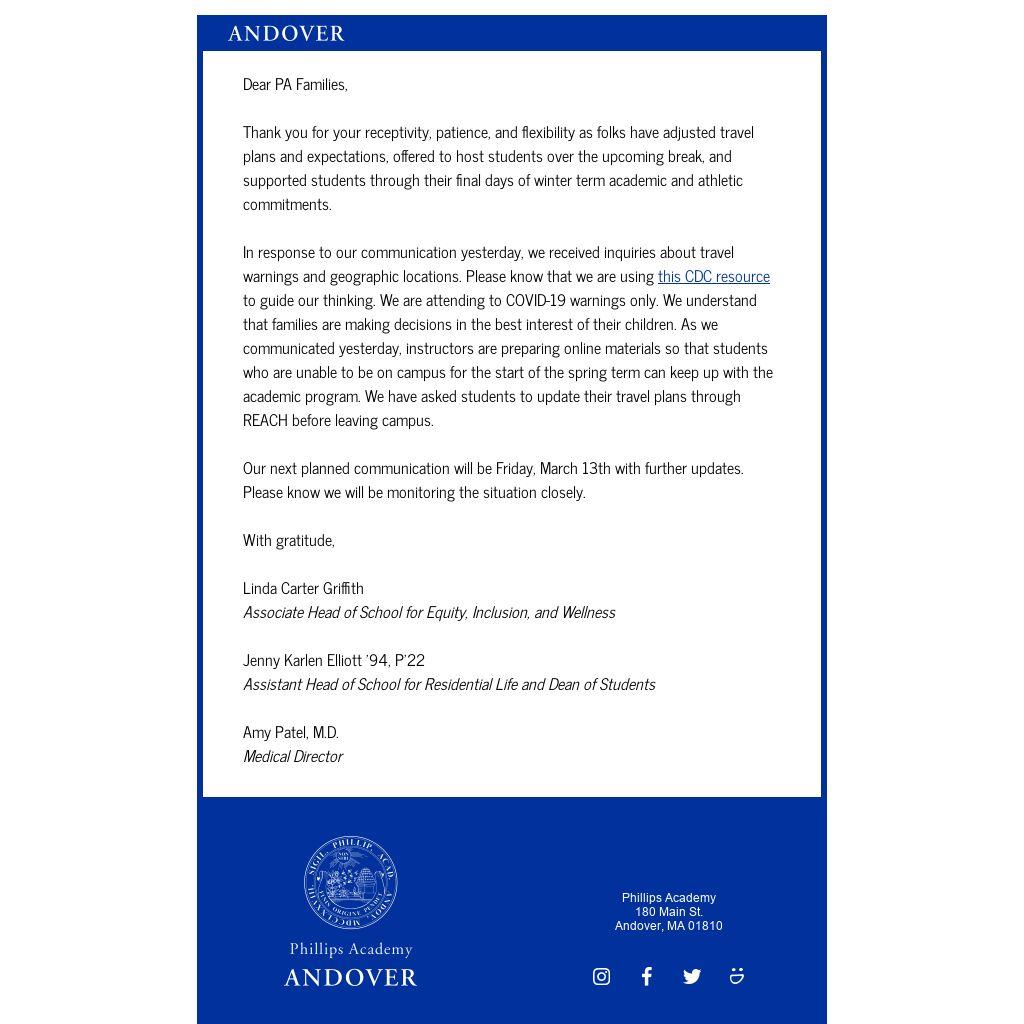 Thank you for your receptivity, patience, and flexibility as folks have adjusted travel plans and expectations, offered to host students over the upcoming break, and supported students through their final days of winter term academic and athletic commitments.