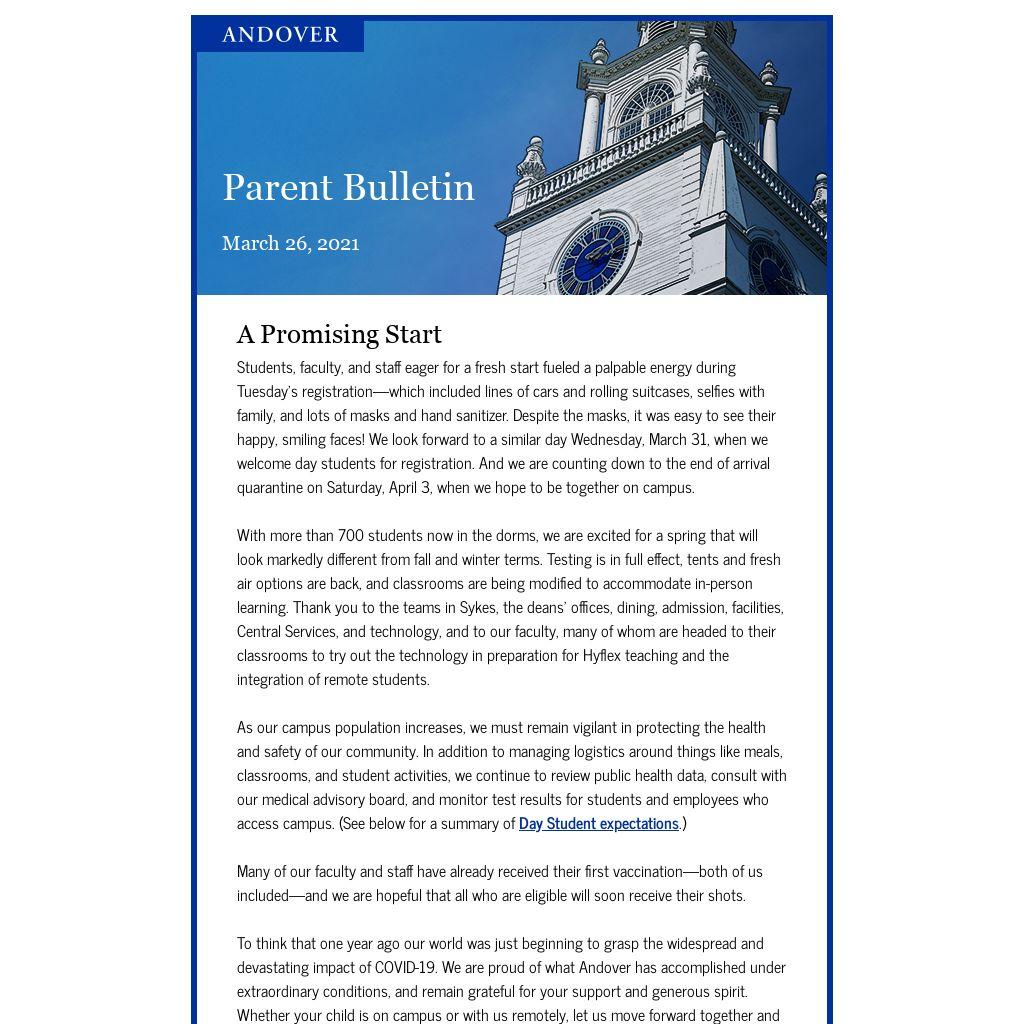 To think that one year ago our world was just beginning to grasp the widespread and devastating impact of COVID-19. We are proud of what Andover has accomplished under extraordinary conditions, and remain grateful for your support and generous spirit. Whether your child is on campus or with us remotely, let us move forward together and make the next 10 weeks of spring term as rejuvenating and joyful as possible.