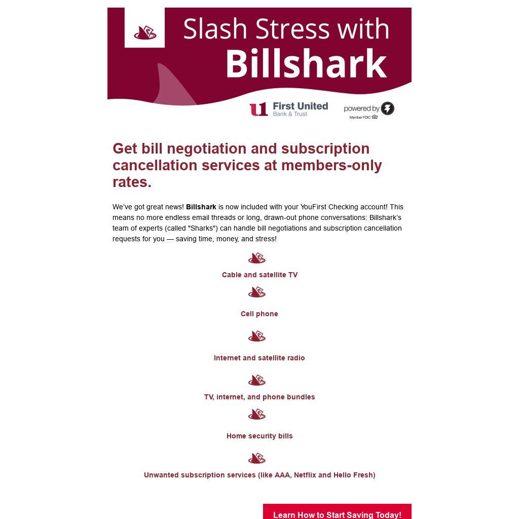 We’ve got great news! Billshark is now included with your YouFirst Checking account! This means no more endless email threads or long, drawn-out phone conversations: Billshark’s team of experts (called "Sharks") can handle bill negotiations and subscription cancellation requests for you — saving time, money, and stress!