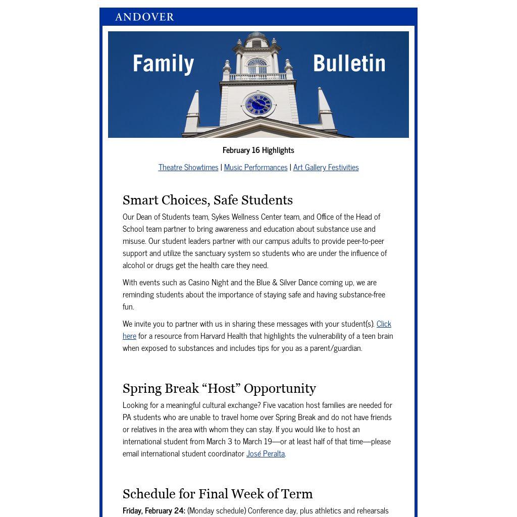 You received this message because you are a valued member of the Andover community. We are obligated to communicate with you, and require you to be on our email list while your student(s) attends Phillips Academy. For more information contact the Dean of Studies Office. |
