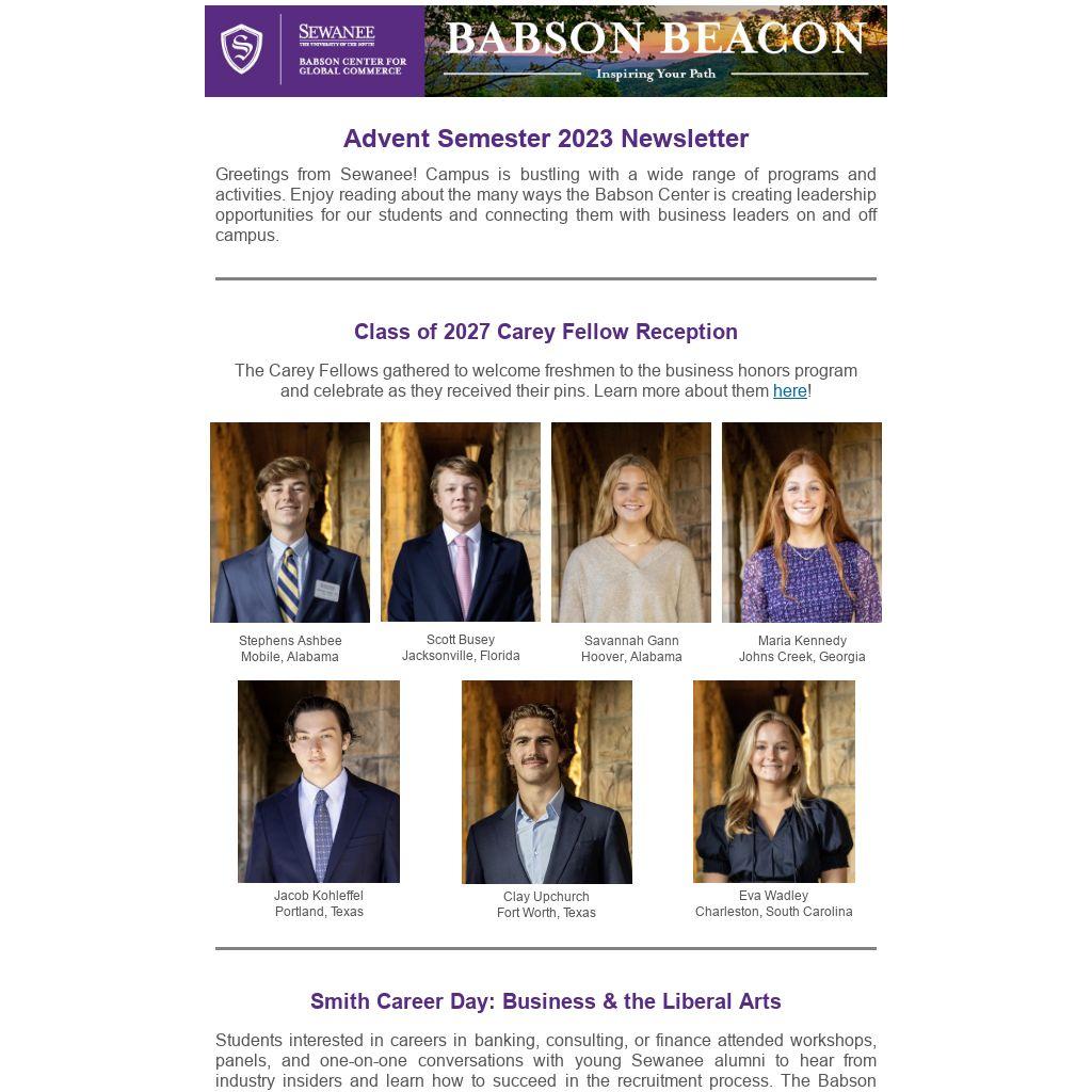 Greetings from Sewanee! Campus is bustling with a wide range of programs and activities. Enjoy reading about the many ways the Babson Center is creating leadership opportunities for our students and connecting them with business leaders on and off campus.