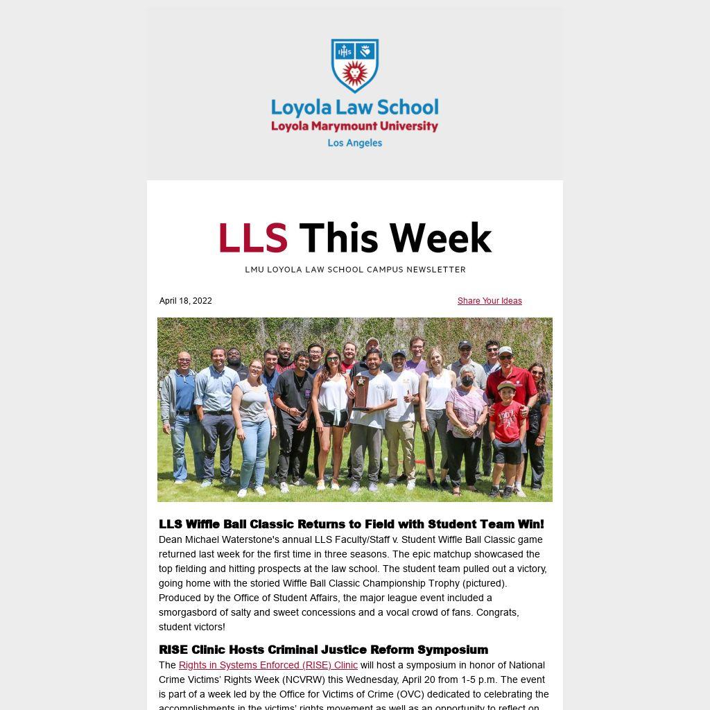Dean Michael Waterstone's annual LLS Faculty/Staff v. Student Wiffle Ball Classic game returned last week for the first time in three seasons. The epic matchup showcased the top fielding and hitting prospects at the law school. The student team pulled out a victory, going home with the storied Wiffle Ball Classic Championship Trophy (pictured). Produced by the Office of Student Affairs, the major league event included a smorgasbord of salty and sweet concessions and a vocal crowd of fans. Congrats, student victors!