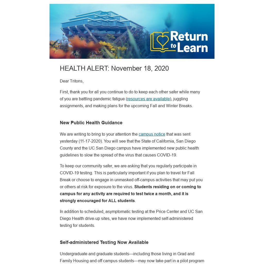 We are writing to bring to your attention the campus notice that was sent yesterday (11-17-2020). You will see that the State of California, San Diego County and the UC San Diego campus have implemented new public health guidelines to slow the spread of the virus that causes COVID-19.