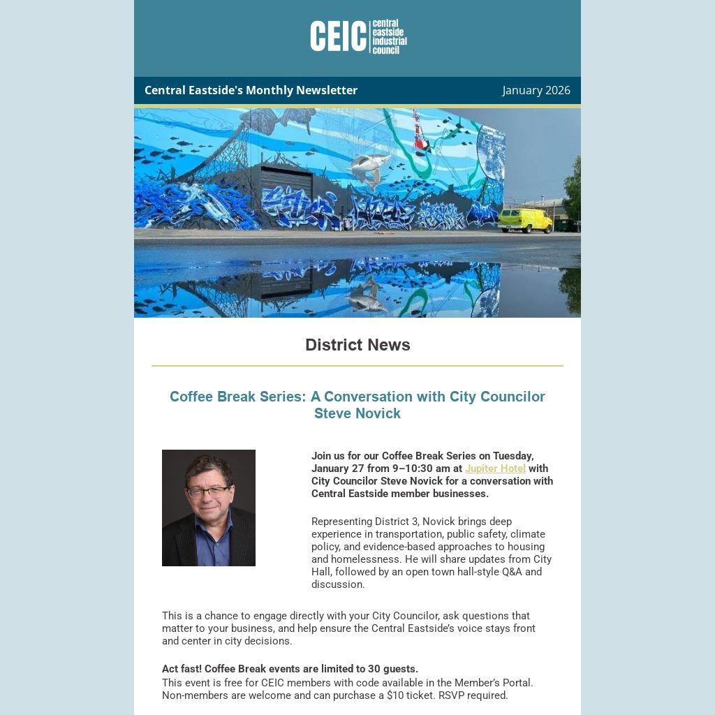 Join us for our Coffee Break Series on Tuesday, January 27 from 9–10:30 am at Jupiter Hotel with City Councilor Steve Novick for a conversation with Central Eastside member businesses.