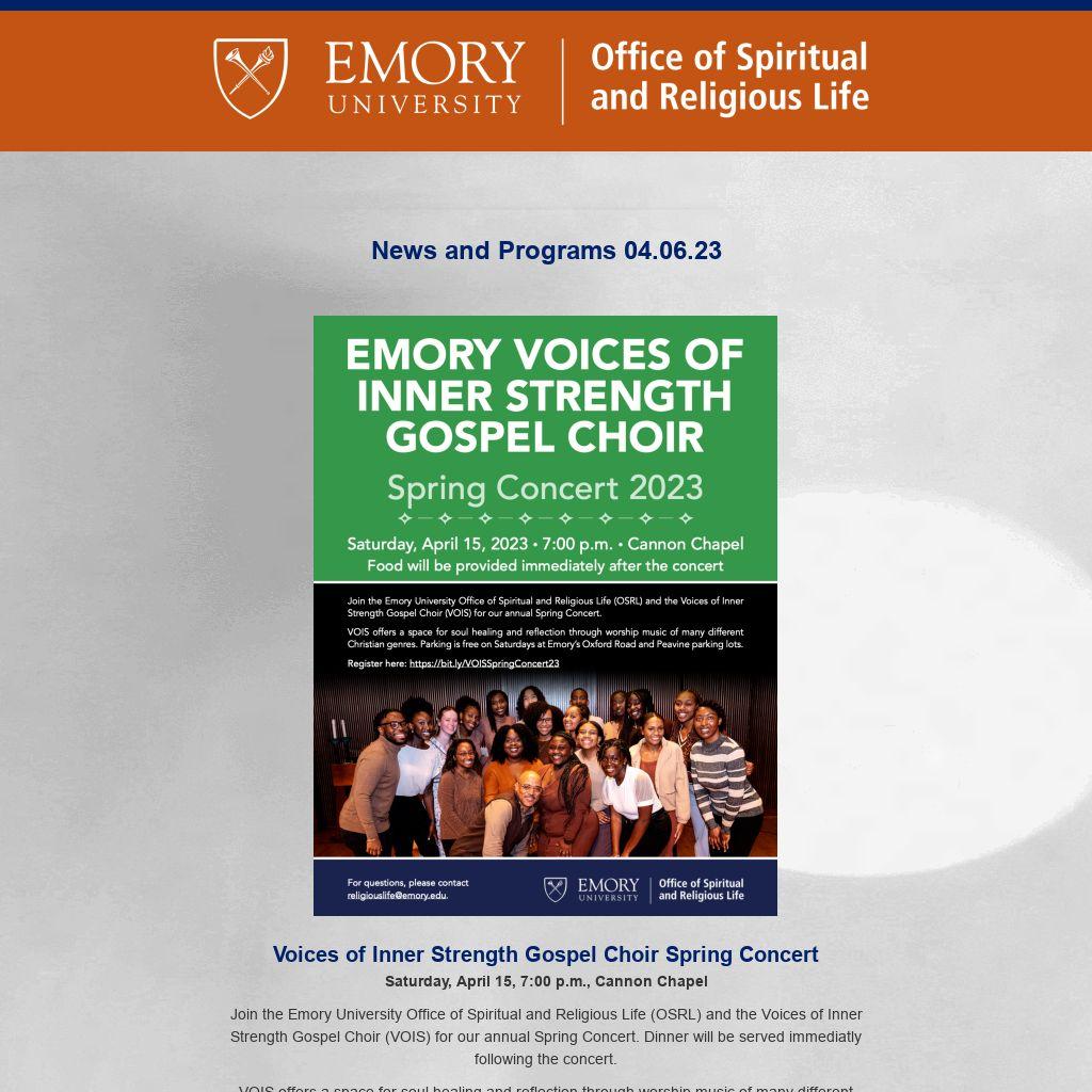 Emory OSRL ENews is published weekly during the term by the Emory University Office of Spiritual and Religious Life publicizing Atlanta-campus spiritual life programs. It is not a comprehensive listing. For Oxford College spiritual life, please click here. To submit information or to update your preferences, please contact religiouslife@emory.edu.
