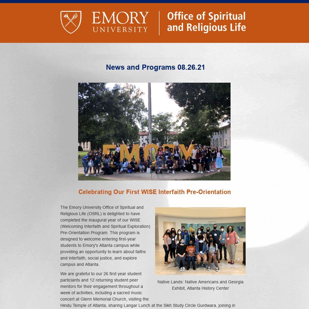 Emory OSRL Enews is published weekly during term by the Emory University Office of Spiritual and Religious Life publicizing Atlanta-campus spiritual life programs. It is not a comprehensive listing. For Oxford College spiritual life, please click here. To submit information or to update your preferences, please contact religiouslife@emory.edu.