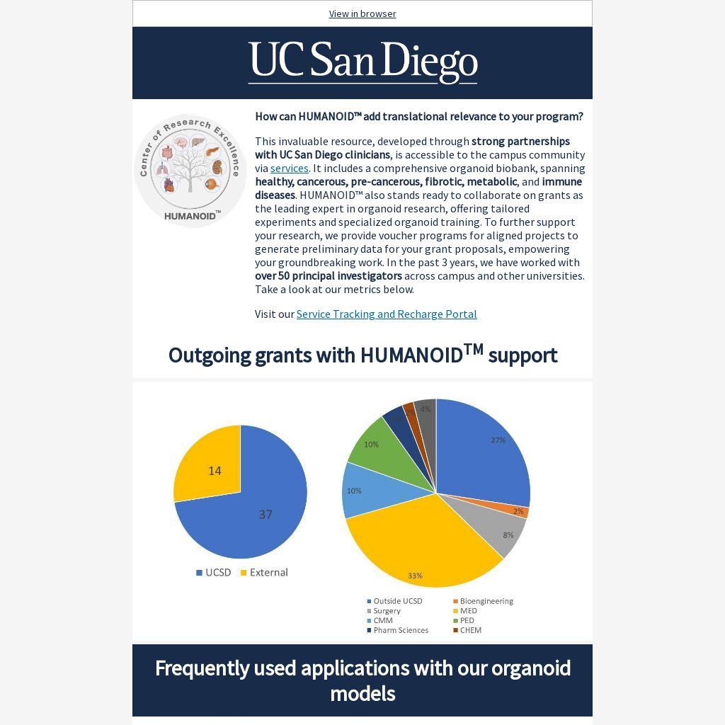 This invaluable resource, developed through strong partnerships with UC San Diego clinicians, is accessible to the campus community via services. It includes a comprehensive organoid biobank, spanning healthy, cancerous, pre-cancerous, fibrotic, metabolic, and immune diseases. HUMANOID™ also stands ready to collaborate on grants as the leading expert in organoid research, offering tailored experiments and specialized organoid training. To further support your research, we provide voucher programs for aligned projects to generate preliminary data for your grant proposals, empowering your groundbreaking work. In the past 3 years, we have worked with over 50 principal investigators across campus and other universities. Take a look at our metrics below.