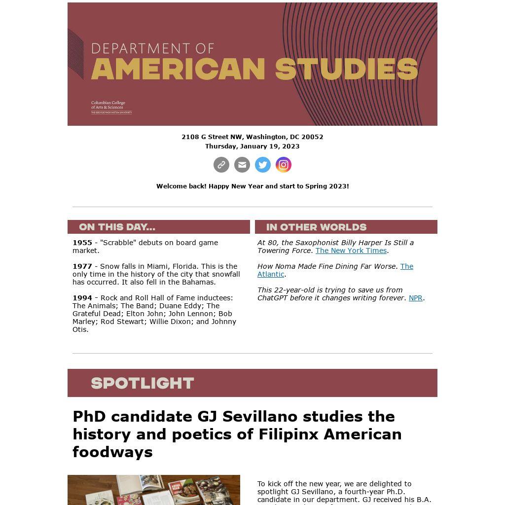 To kick off the new year, we are delighted to spotlight GJ Sevillano, a fourth-year Ph.D. candidate in our department. GJ received his B.A. in Politics and a certificate in American Studies from Princeton University in 2019, and received his M.A. in American Studies from GW in 2021. He grew up in Historic Filipinotown, Los Angeles, California, and is currently conducting dissertation research about Filipinx American foodways. Sevillano explains that his dissertation “aims to analyze the intersections between food, race, gender, sexuality, and colonialism in the context of the Filipino American diaspora.” By studying different novels, cookbooks, recipes, and culinary cultures he is able to unpack how “acts of commensality (procurement, production, consumption, and reproduction) actively shape the formation of Filipino Americaness.” Sevillano stated that he seeks to “understand the cooks as cultural theorists and these gastronomical acts as postcolonial praxis.”