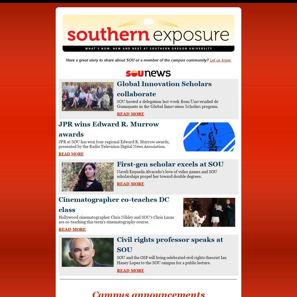 Submit Southern Exposure announcements (not events) to the campus community here. Campus events – other than those of campuswide and broad community interest – should instead be submitted to the SOU Events Calendar.