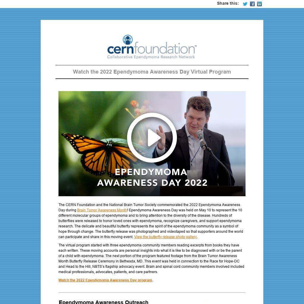 The CERN Foundation and the National Brain Tumor Society commemorated the 2022 Ependymoma Awareness Day during