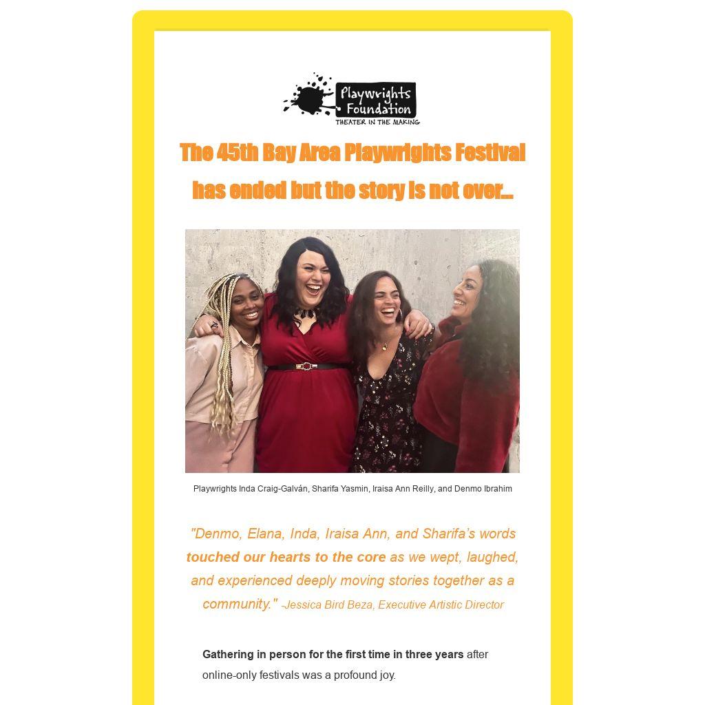 We thank the inspiring artistic teams, the committed audiences who gathered with us in person in San Francisco and from around the world for the livestreams, and we thank the playwrights whose work give our festival purpose.