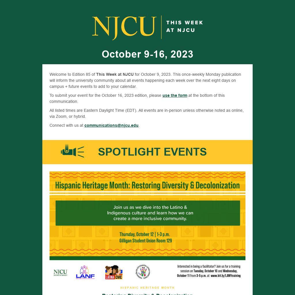 Welcome to Edition 85 of This Week at NJCU for October 9, 2023. This once-weekly Monday publication will inform the university community about all events happening each week over the next eight days on campus + future events to add to your calendar.