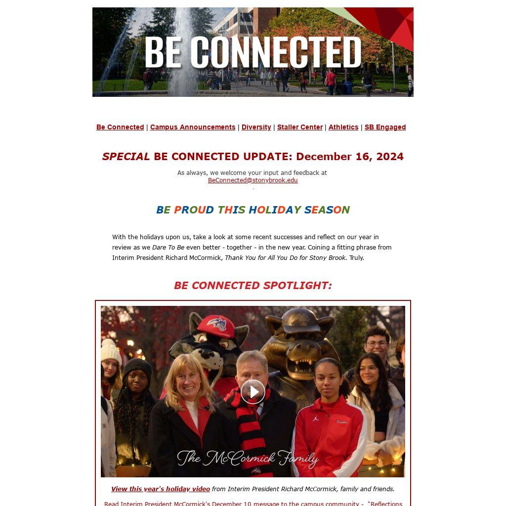 With the holidays upon us, take a look at some recent successes and reflect on our year in review as we Dare To Be even better - together - in the new year. Coining a fitting phrase from Interim President Richard McCormick, Thank You for All You Do for Stony Brook. Truly.
