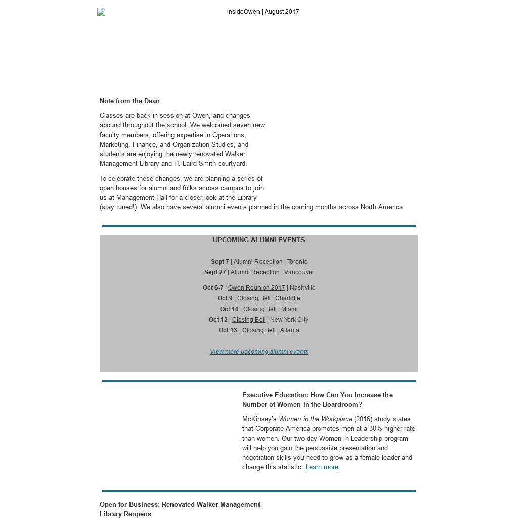 | Note from the Dean Classes are back in session at Owen, and changes abound throughout the school. We welcomed seven new faculty members, offering expertise in Operations, Marketing, Finance, and Organization Studies, and students are enjoying the newly renovated Walker Management Library and H. Laird Smith courtyard. To celebrate these changes, we are planning a series of open houses for alumni and folks across campus to join us at Management Hall for a closer look at the Library (stay tuned!). We also have several alumni events planned in the coming months across North America.