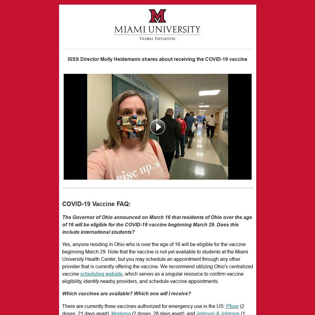 Miami University has begun offering the vaccine to certain employees and is working towards being able to offer it to the entire community. You are encouraged to check here for updates on when and how that is occurring.