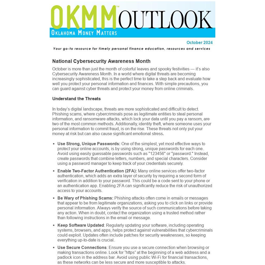 With October being Cybersecurity Awareness Month, remember that protecting your personal information and finances is ongoing. Adopting these simple yet effective practices can significantly reduce your risk of falling victim to cyber threats. Staying vigilant and informed will protect your wallet and give you peace of mind.