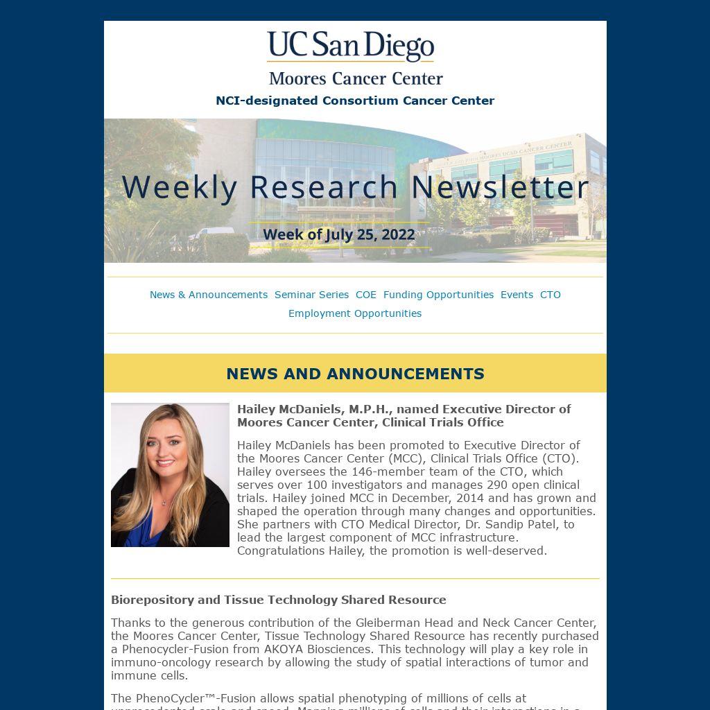 If you have newsworthy items to contribute, then please contact our Marketing & Communications Manager, Renee Maude at amaude@health.ucsd.edu.