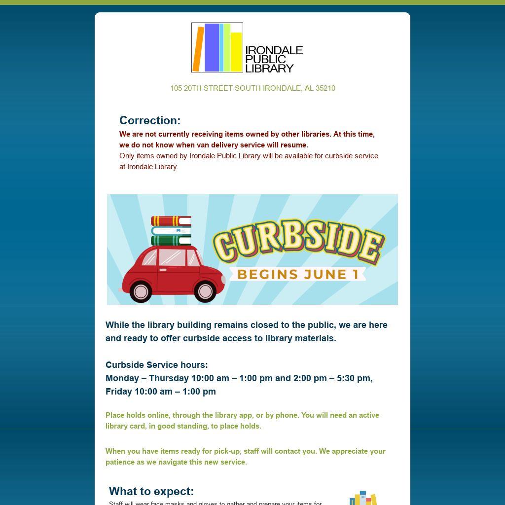 Staff are not allowed to accept returned items handed directly to them. Library returns may be placed in the designated plastic bin inside the double doors at the front of the library. There will be signs.