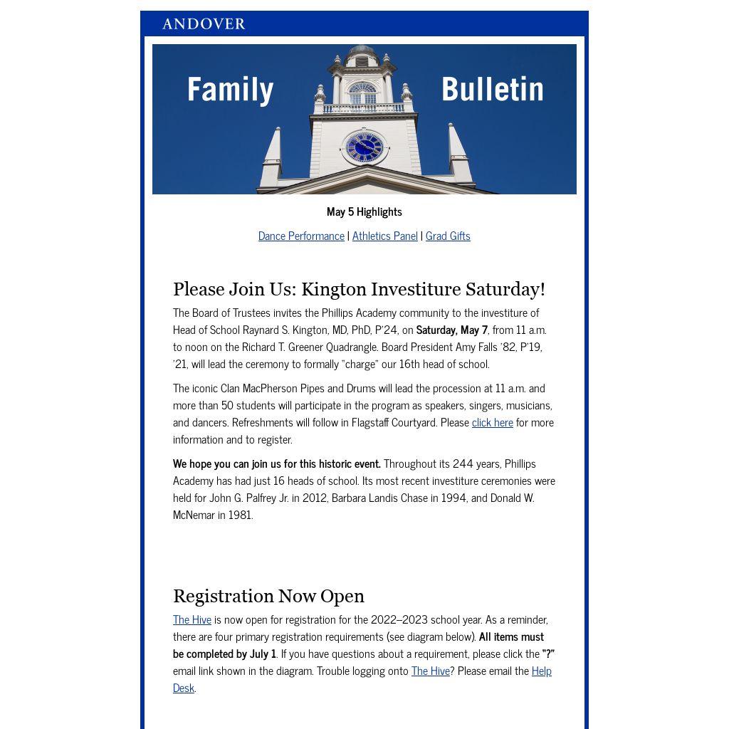 You received this message because you are a valued member of the Andover community. We are obligated to communicate with you, and require you to be on our email list while your student(s) attends Phillips Academy. For more information contact the Dean of Studies Office. |