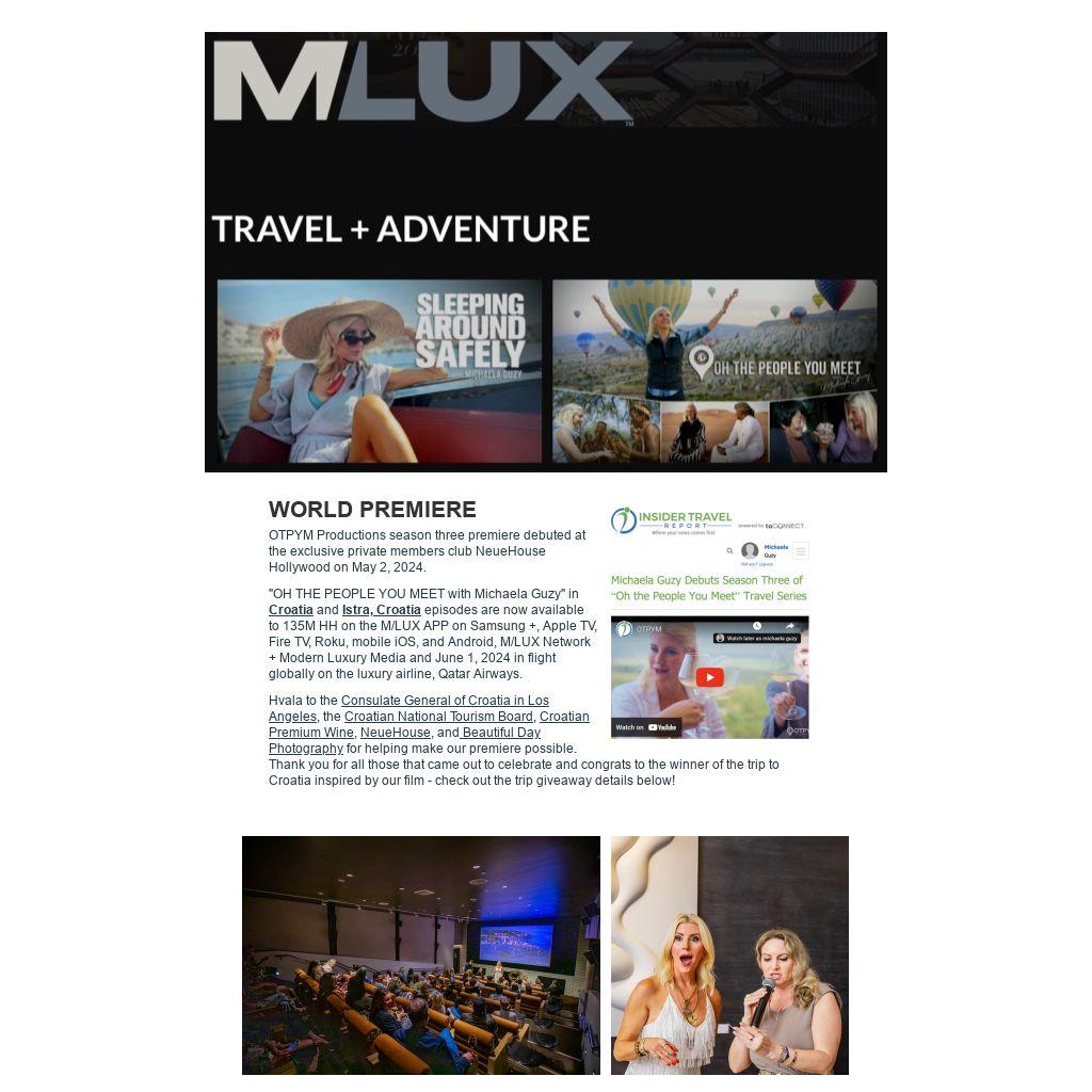 "OH THE PEOPLE YOU MEET with Michaela Guzy" in Croatia and Istra, Croatia episodes are now available to 135M HH on the M/LUX APP on Samsung +, Apple TV, Fire TV, Roku, mobile iOS, and Android, M/LUX Network + Modern Luxury Media and June 1, 2024 in flight globally on the luxury airline, Qatar Airways.