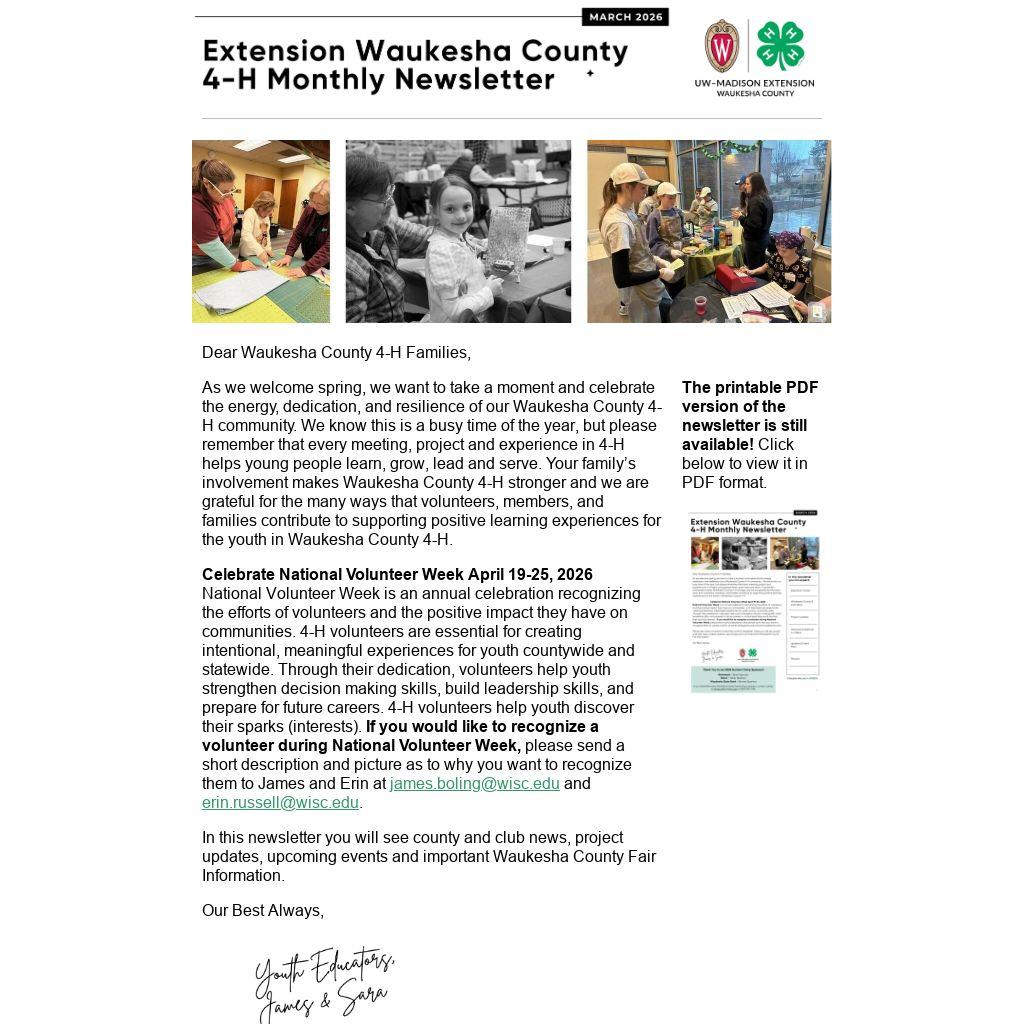 As we welcome spring, we want to take a moment and celebrate the energy, dedication, and resilience of our Waukesha County 4-H community. We know this is a busy time of the year, but please remember that every meeting, project and experience in 4-H helps young people learn, grow, lead and serve. Your family’s involvement makes Waukesha County 4-H stronger and we are grateful for the many ways that volunteers, members, and families contribute to supporting positive learning experiences for the youth in Waukesha County 4-H.