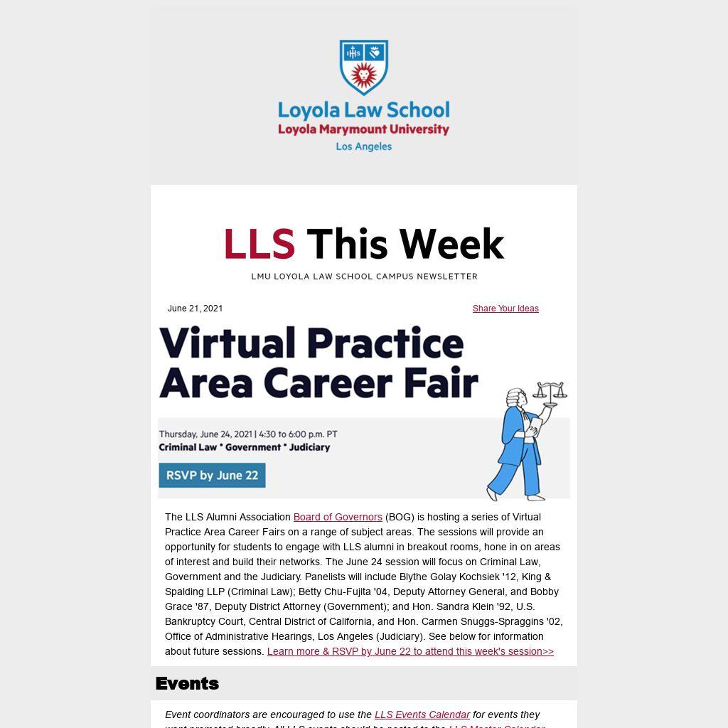The LLS Alumni Association Board of Governors (BOG) is hosting a series of Virtual Practice Area Career Fairs on a range of subject areas. The sessions will provide an opportunity for students to engage with LLS alumni in breakout rooms, hone in on areas of interest and build their networks. The June 24 session will focus on Criminal Law, Government and the Judiciary. Panelists will include Blythe Golay Kochsiek '12, King & Spalding LLP (Criminal Law); Betty Chu-Fujita '04, Deputy Attorney General, and Bobby Grace '87, Deputy District Attorney (Government); and Hon. Sandra Klein '92, U.S. Bankruptcy Court, Central District of California, and Hon. Carmen Snuggs-Spraggins '02, Office of Administrative Hearings, Los Angeles (Judiciary). See below for information about future sessions. Learn more & RSVP by June 22 to attend this week's session>>