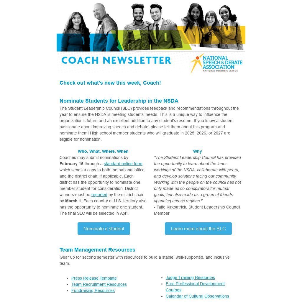 The Student Leadership Council (SLC) provides feedback and recommendations throughout the year to ensure the NSDA is meeting students’ needs. This is a unique way to influence the organization’s future and an excellent addition to any student’s resume. If you know a student passionate about improving speech and debate, please tell them about this program and nominate them! High school member students who will graduate in 2025, 2026, or 2027 are eligible for nomination.