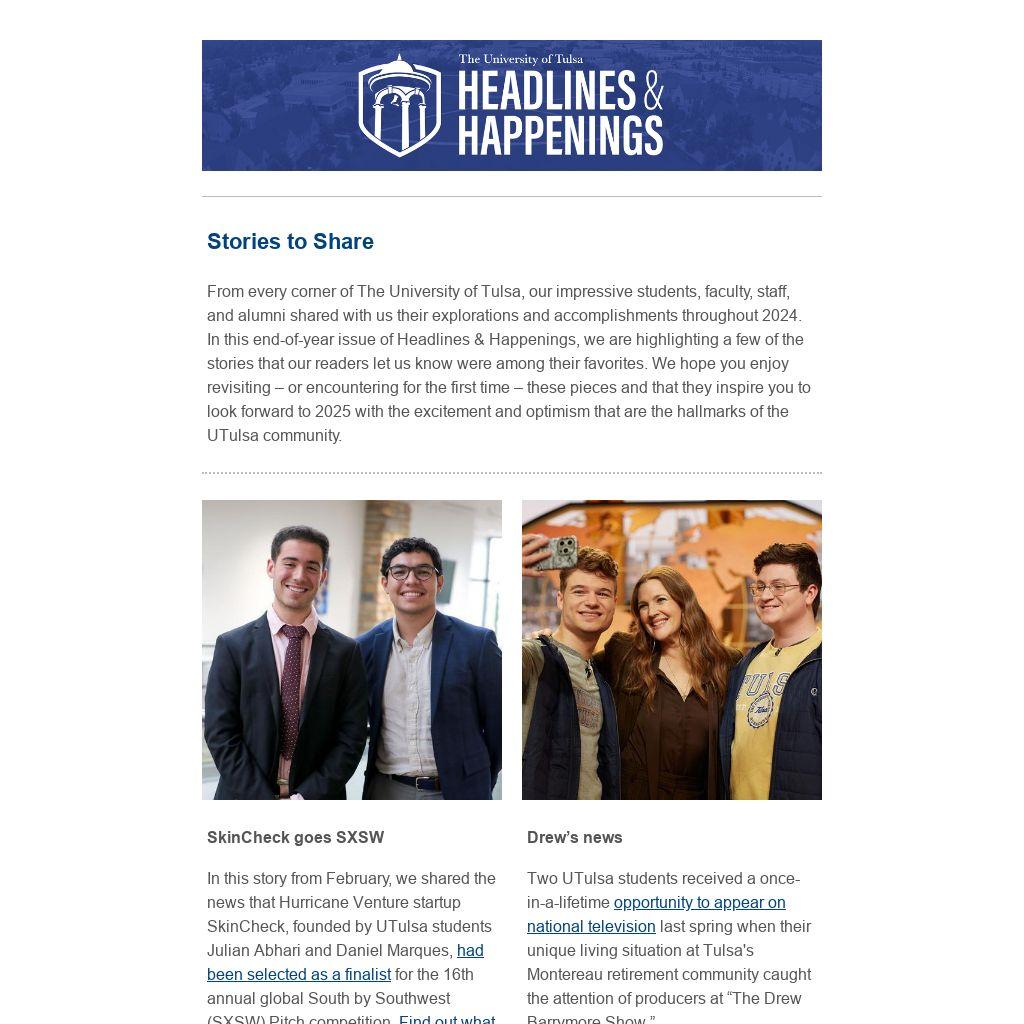 From every corner of The University of Tulsa, our impressive students, faculty, staff, and alumni shared with us their explorations and accomplishments throughout 2024. In this end-of-year issue of Headlines & Happenings, we are highlighting a few of the stories that our readers let us know were among their favorites. We hope you enjoy revisiting – or encountering for the first time – these pieces and that they inspire you to look forward to 2025 with the excitement and optimism that are the hallmarks of the UTulsa community.