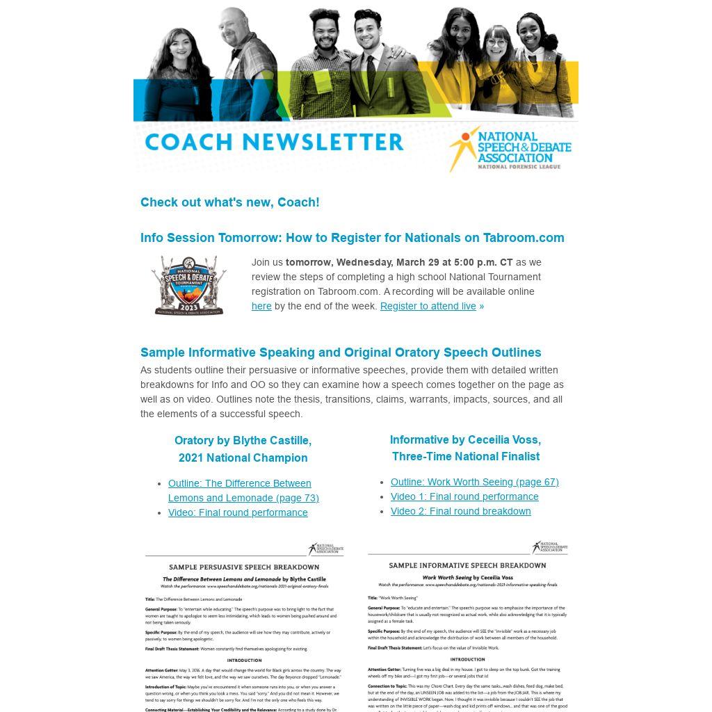 Join us tomorrow, Wednesday, March 29 at 5:00 p.m. CT as we review the steps of completing a high school National Tournament registration on Tabroom.com. A recording will be available online here by the end of the week. Register to attend live »