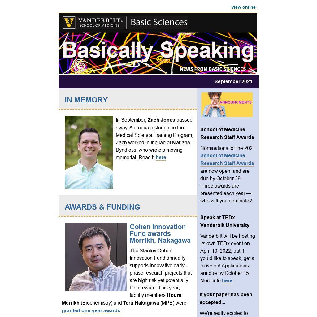 This newsletter recognizes the achievements and latest discoveries of students, postdocs, faculty, and staff associated with Basic Sciences departments, centers, and cores or who carry out basic biomedical research.