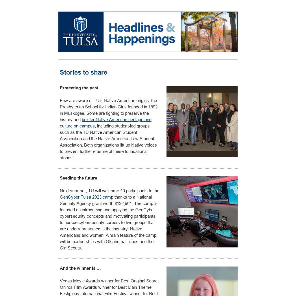 Next summer, TU will welcome 40 participants to the GenCyber Tulsa 2023 camp thanks to a National Security Agency grant worth $132,961. The camp is focused on introducing and applying the GenCyber cybersecurity concepts and motivating participants to pursue cybersecurity careers to two groups that are underrepresented in the industry: Native Americans and women. A main feature of the camp will be partnerships with Oklahoma Tribes and the Girl Scouts.