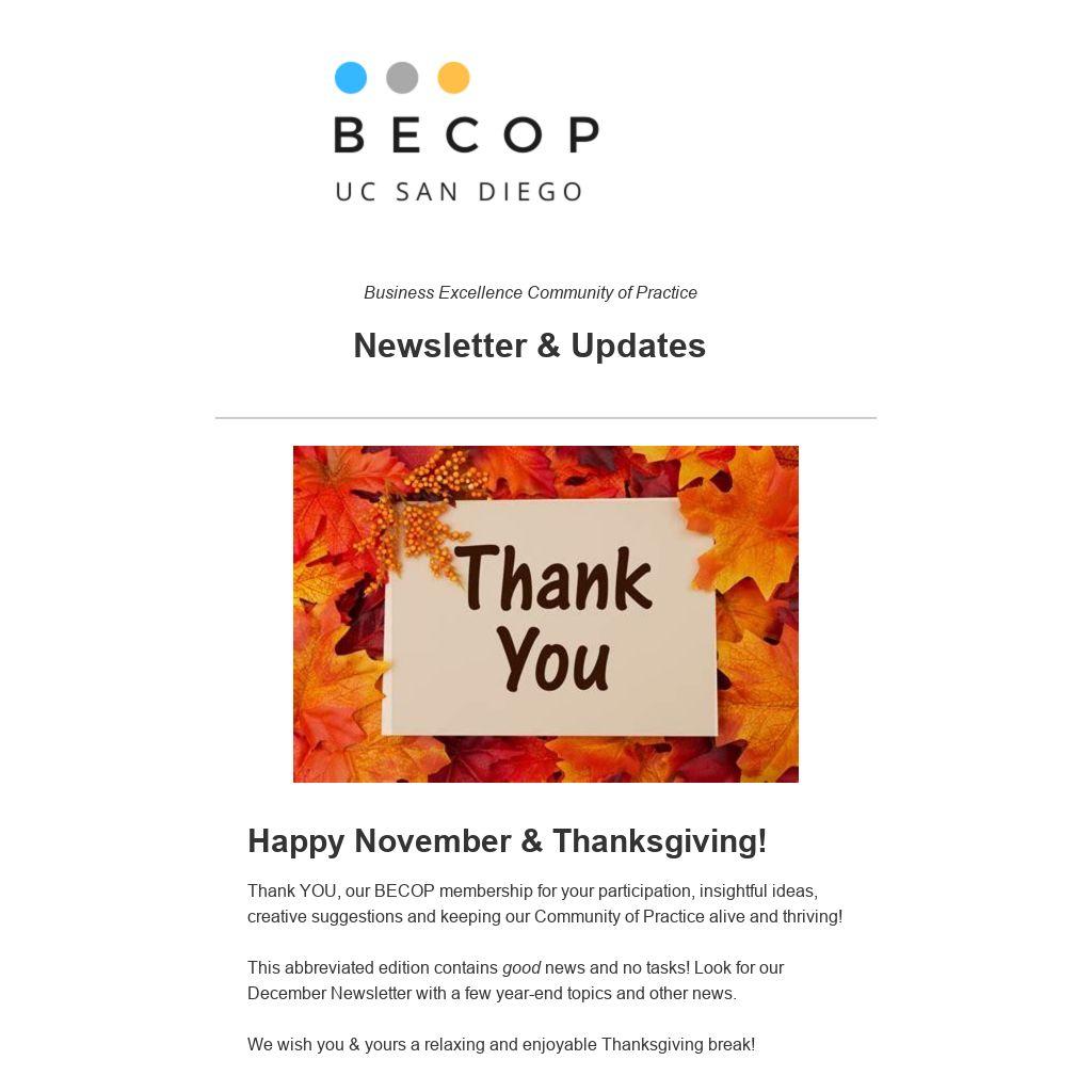 Thank YOU, our BECOP membership for your participation, insightful ideas, creative suggestions and keeping our Community of Practice alive and thriving!