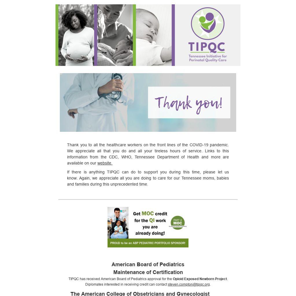 If there is anything TIPQC can do to support you during this time, please let us know. Again, we appreciate all you are doing to care for our Tennessee moms, babies and families during this unprecedented time.
