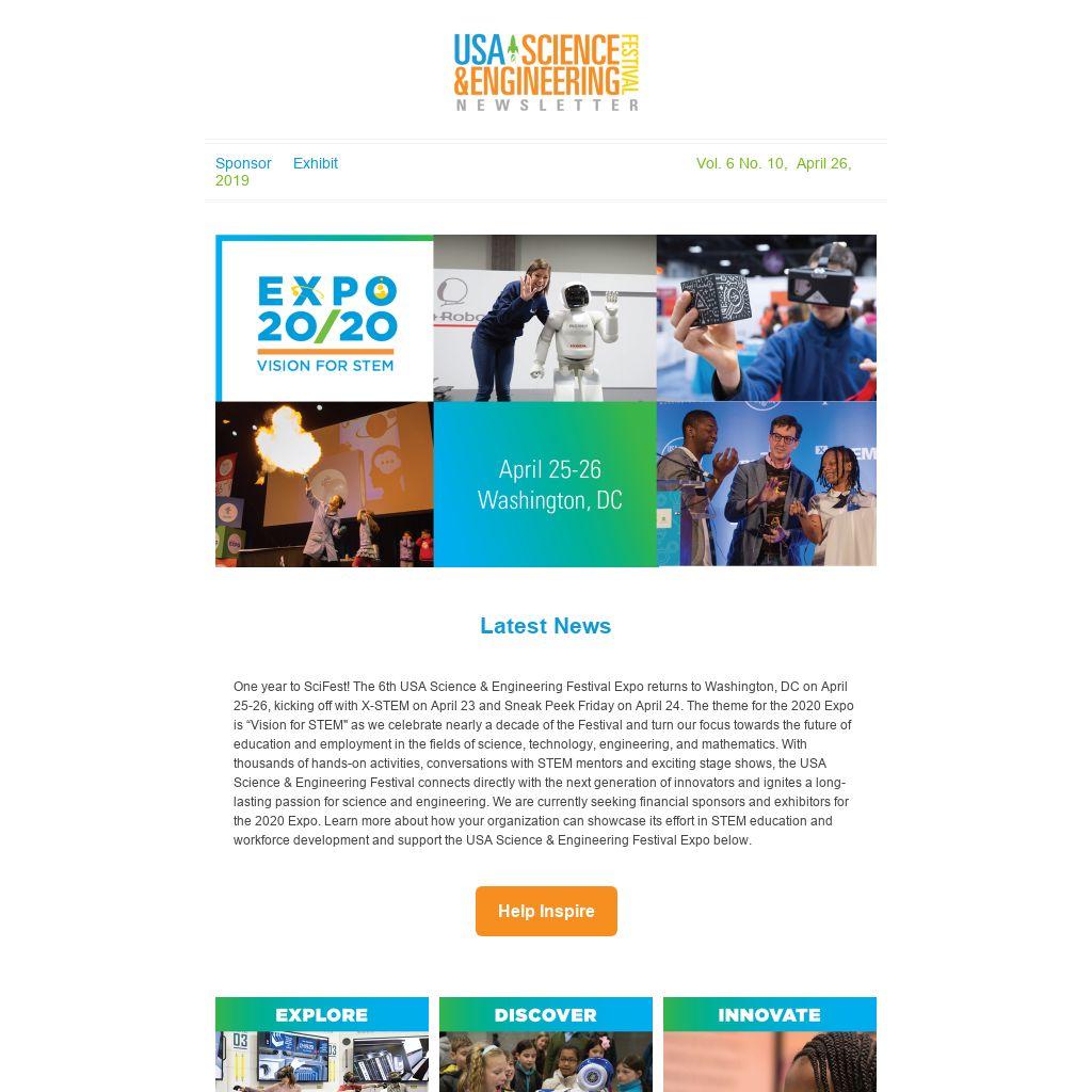 | One year to SciFest! The 6th USA Science & Engineering Festival Expo returns to Washington, DC on April 25-26, kicking off with X-STEM on April 23 and Sneak Peek Friday on April 24. The theme for the 2020 Expo is “Vision for STEM" as we celebrate nearly a decade of the Festival and turn our focus towards the future of education and employment in the fields of science, technology, engineering, and mathematics. With thousands of hands-on activities, conversations with STEM mentors and exciting stage shows, the USA Science & Engineering Festival connects directly with the next generation of innovators and ignites a long-lasting passion for science and engineering. We are currently seeking financial sponsors and exhibitors for the 2020 Expo. Learn more about how your organization can showcase its effort in STEM education and workforce development and support the USA Science & Engineering Festival Expo below.