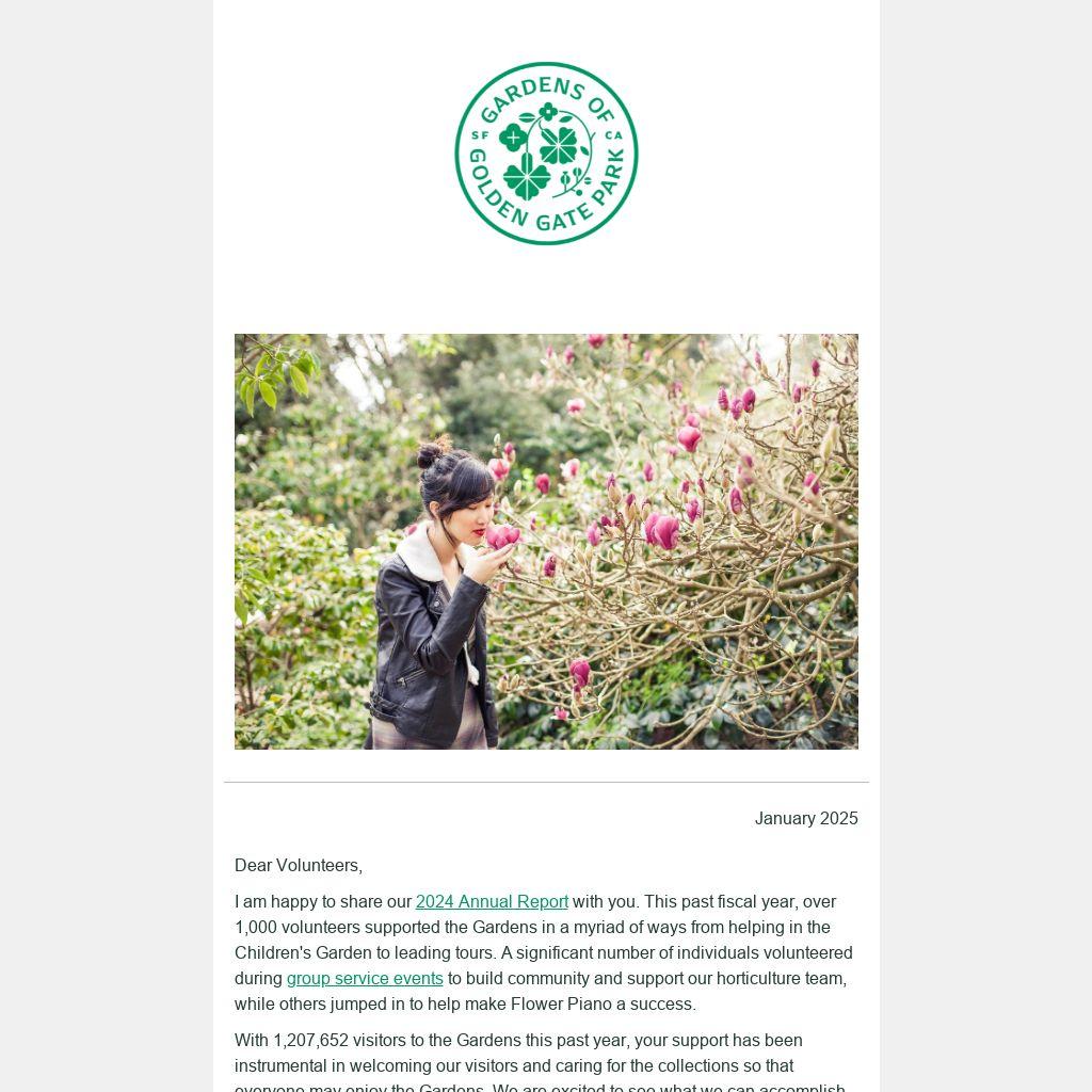 I am happy to share our 2024 Annual Report with you. This past fiscal year, over 1,000 volunteers supported the Gardens in a myriad of ways from helping in the Children's Garden to leading tours. A significant number of individuals volunteered during group service events to build community and support our horticulture team, while others jumped in to help make Flower Piano a success.