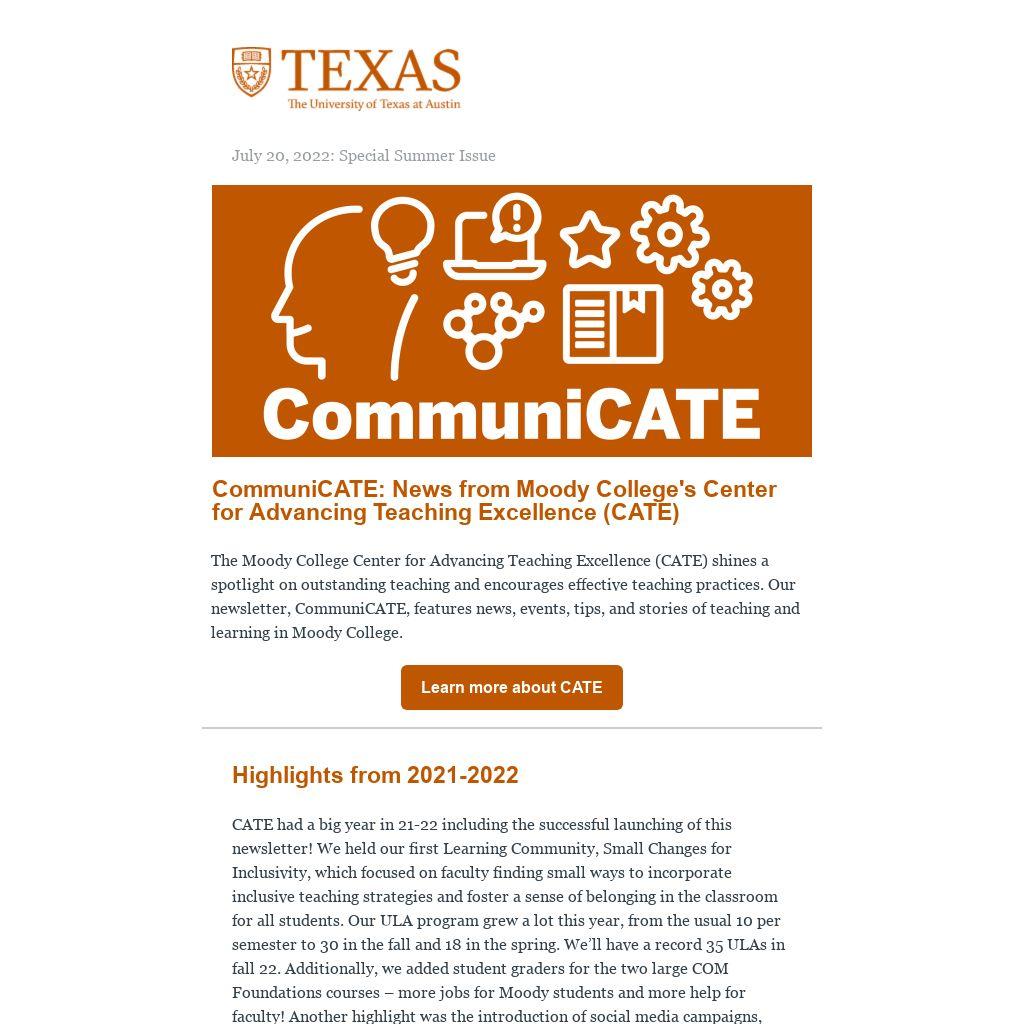 The Moody College Center for Advancing Teaching Excellence (CATE) shines a spotlight on outstanding teaching and encourages effective teaching practices. Our newsletter, CommuniCATE, features news, events, tips, and stories of teaching and learning in Moody College.