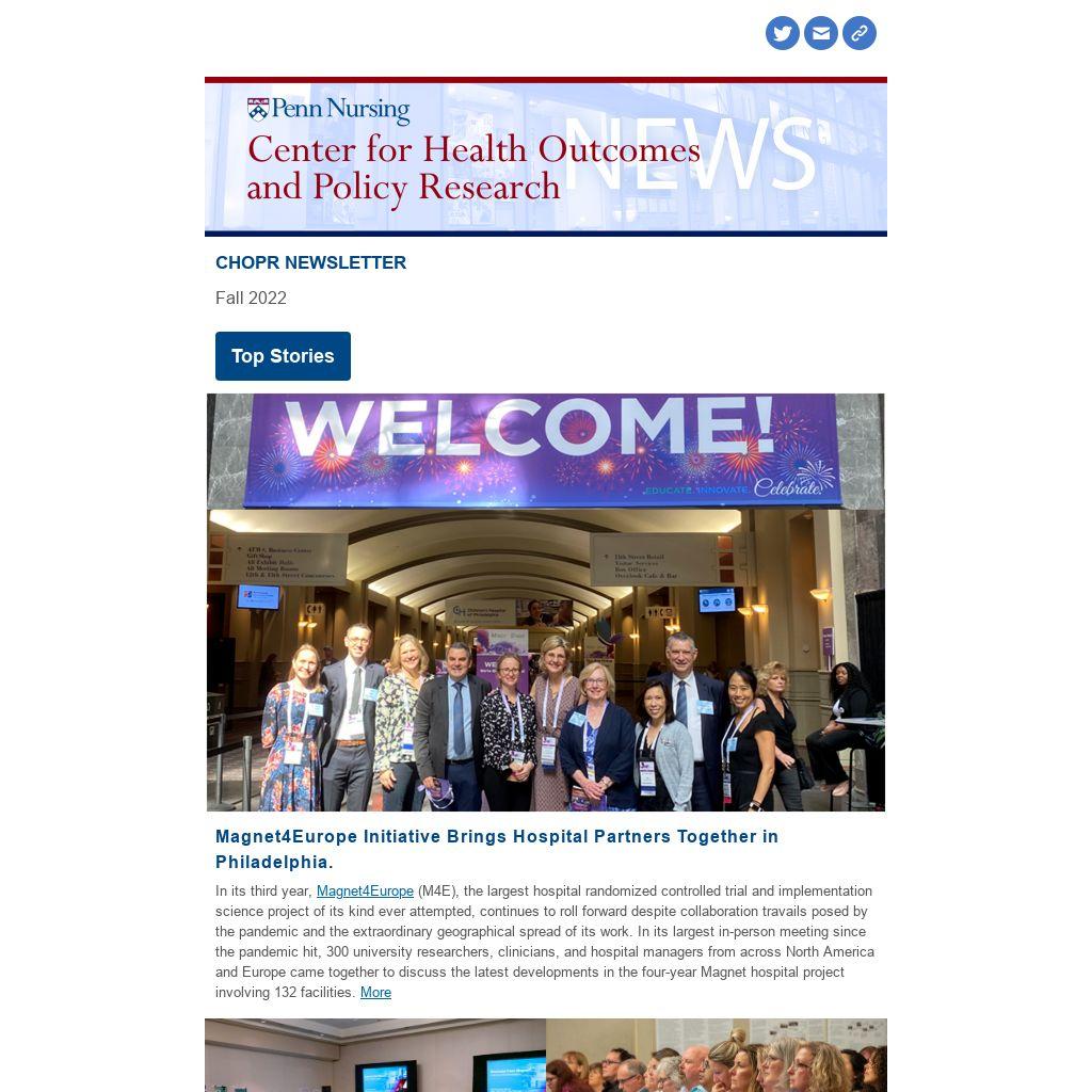 Dr. James Ballinghoff, Chief Nursing Officer and Associate Executive Director at Penn Presbyterian Medical Center (PPMC) since 2012, will maintain his post there while taking on systemwide responsibilities. Ballinghoff led PPMC to two re-designations as a Magnet® hospital and served as a key leader in the transition of Penn Medicine’s Trauma Center from the Hospital of the University of Pennsylvania to PPMC. Jim will also continue to work closely with the School of Nursing as Assistant Dean for Clinical Practice. Our longtime collaborator continues to work closely with CHOPR as part of PPMC's participation in Magnet4Europe. More