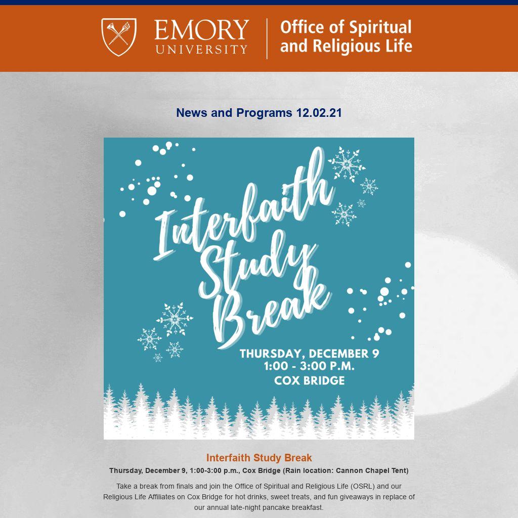 Emory OSRL ENews is published weekly during term by the Emory University Office of Spiritual and Religious Life publicizing Atlanta-campus spiritual life programs. It is not a comprehensive listing. For Oxford College spiritual life, please click here. To submit information or to update your preferences, please contact religiouslife@emory.edu.