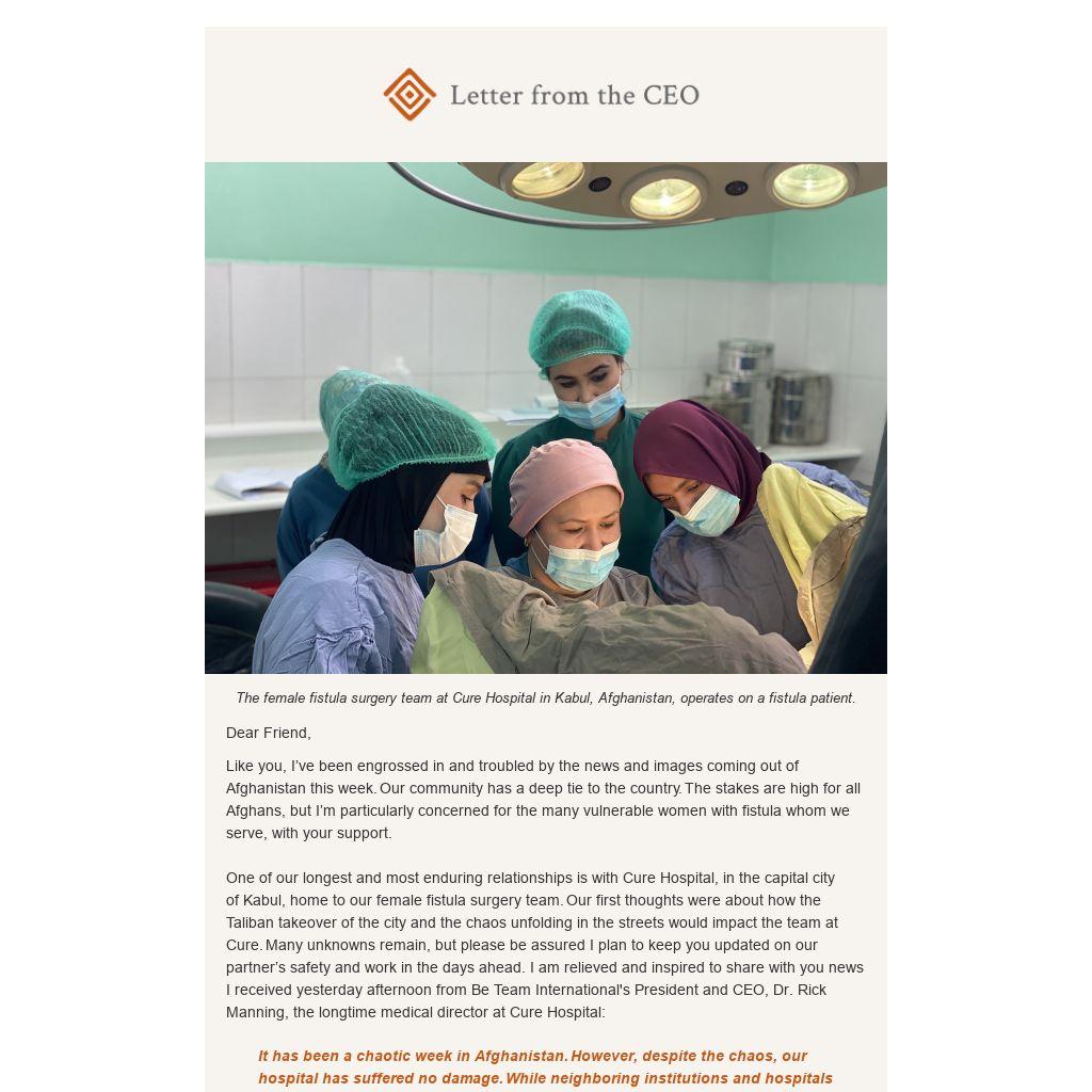 One of our longest and most enduring relationships is with Cure Hospital, in the capital city of Kabul, home to our female fistula surgery team. Our first thoughts were about how the Taliban takeover of the city and the chaos unfolding in the streets would impact the team at Cure. Many unknowns remain, but please be assured I plan to keep you updated on our partner’s safety and work in the days ahead. I am relieved and inspired to share with you news I received yesterday afternoon from Be Team International's President and CEO, Dr. Rick Manning, the longtime medical director at Cure Hospital: