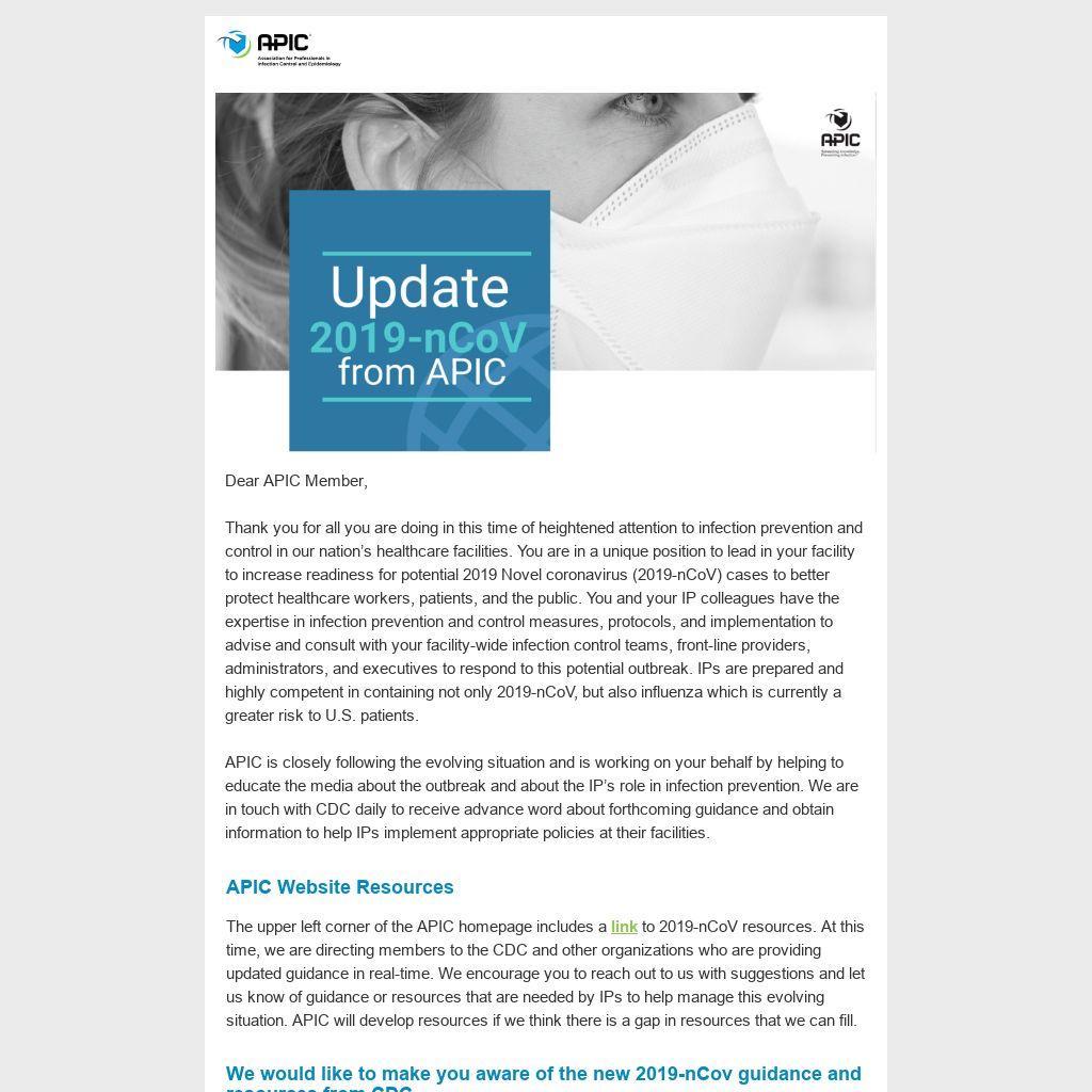Thank you for all you are doing in this time of heightened attention to infection prevention and control in our nation’s healthcare facilities. You are in a unique position to lead in your facility to increase readiness for potential 2019 Novel coronavirus (2019-nCoV) cases to better protect healthcare workers, patients, and the public. You and your IP colleagues have the expertise in infection prevention and control measures, protocols, and implementation to advise and consult with your facility-wide infection control teams, front-line providers, administrators, and executives to respond to this potential outbreak. IPs are prepared and highly competent in containing not only 2019-nCoV, but also influenza which is currently a greater risk to U.S. patients.
