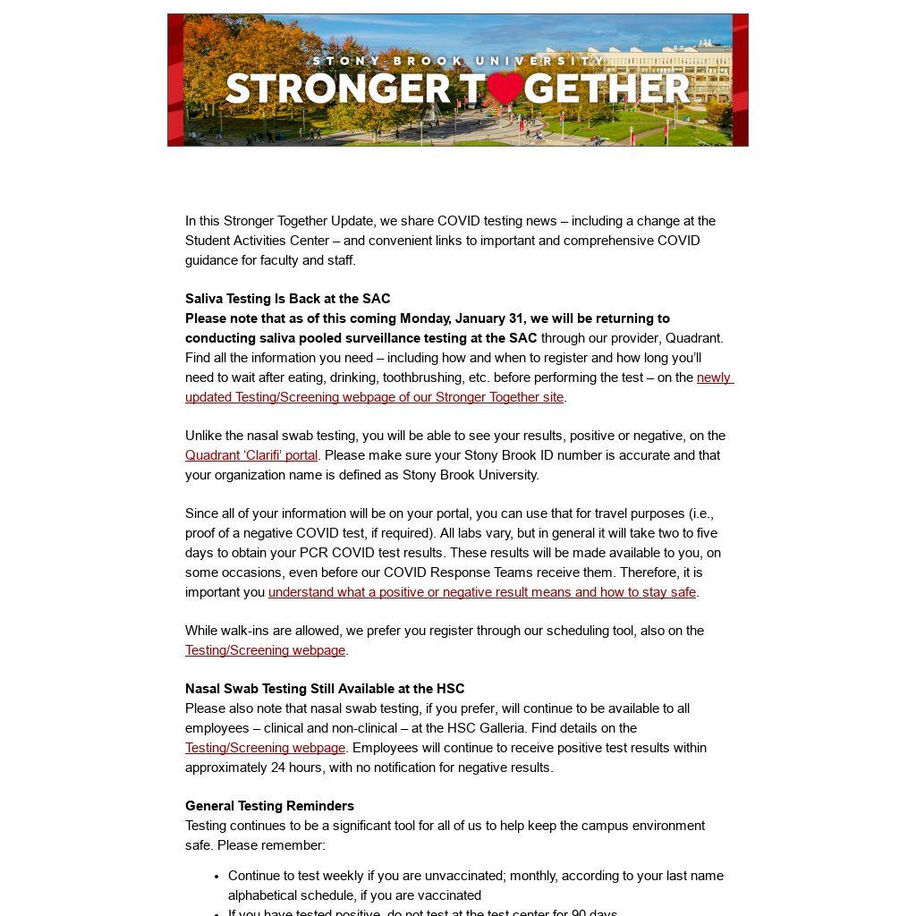 In this Stronger Together Update, we share COVID testing news – including a change at the Student Activities Center – and convenient links to important and comprehensive COVID guidance for faculty and staff.