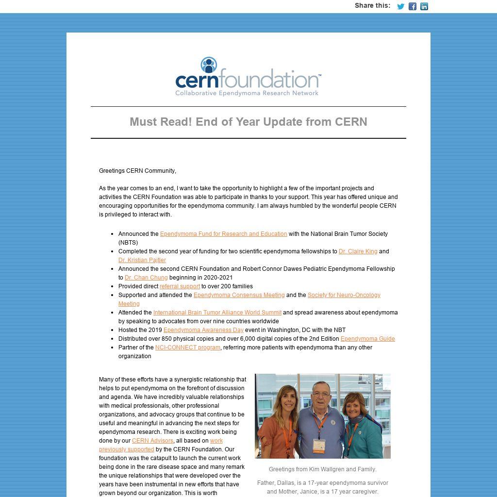 work previously supported by the CERN Foundation. Our foundation was the catapult to launch the current work being done in the rare disease space and many remark the unique relationships that were developed over the years have been instrumental in new efforts that have grown beyond our organization. This is worth celebrating!