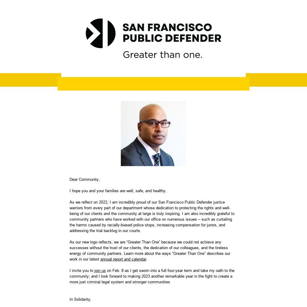 As we reflect on 2022, I am incredibly proud of our San Francisco Public Defender justice warriors from every part of our department whose dedication to protecting the rights and well-being of our clients and the community at large is truly inspiring. I am also incredibly grateful to community partners who have worked with our office on numerous issues – such as curtailing the harms caused by racially-biased police stops, increasing compensation for jurors, and addressing the trial backlog in our courts.
